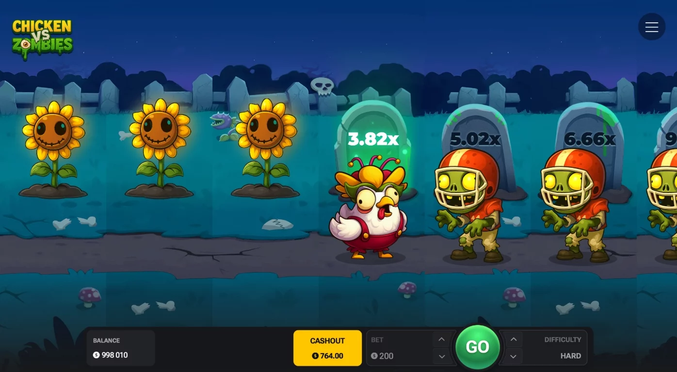 O foco principal está em fazer escolhas instantâneas, enquanto os multiplicadores crescem continuamente a cada instante. No começo de cada partida, os jogadores definem sua aposta inicial. Enquanto a galinha destemida tenta escapar por uma estrada mal-assombrada, o multiplicador de ganhos sobe em tempo real. A ansiedade se intensifica: será que o resgate acontecerá antes que os zumbis vorazes os capturem, ou tudo se transformará em pó com uma única dentada?